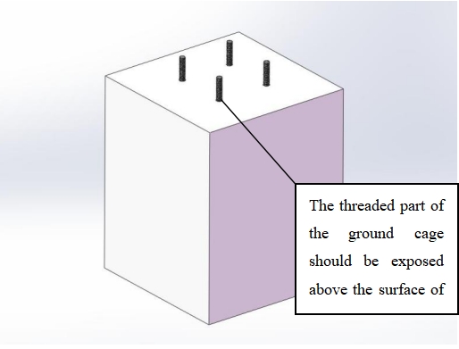 Installation de la base : Coulez une base en ciment de 400 mm x 400 mm x 500 mm avec armature en acier intégrée. Protégez les filetages exposés avec du ruban isolant.