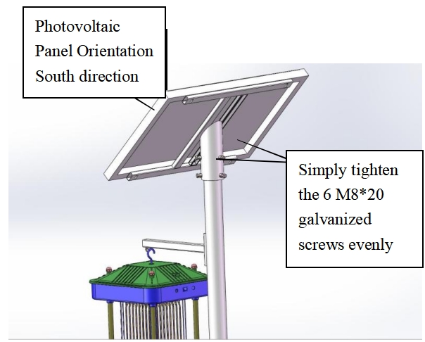 Montage du panneau solaire : fixez le panneau solaire de 40 W au poteau à l'aide d'un support en forme de I, en vous assurant qu'il est orienté vers le sud.