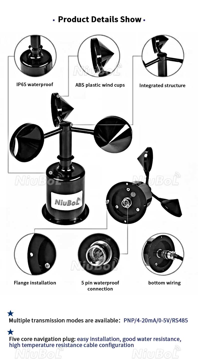 Le capteur de vitesse du vent NiuBoL utilise une coupe de vent en fibre de carbone et une technologie de traitement des signaux de précision pour garantir une grande précision et des performances de mesure fiables. Son format de sortie 0-5V permet de l'intégrer facilement dans toutes sortes de systèmes de surveillance. Il convient à de nombreux domaines tels que la météorologie, la marine, l'environnement, les aéroports, les ports, les laboratoires, l'industrie, l'agriculture et les ···