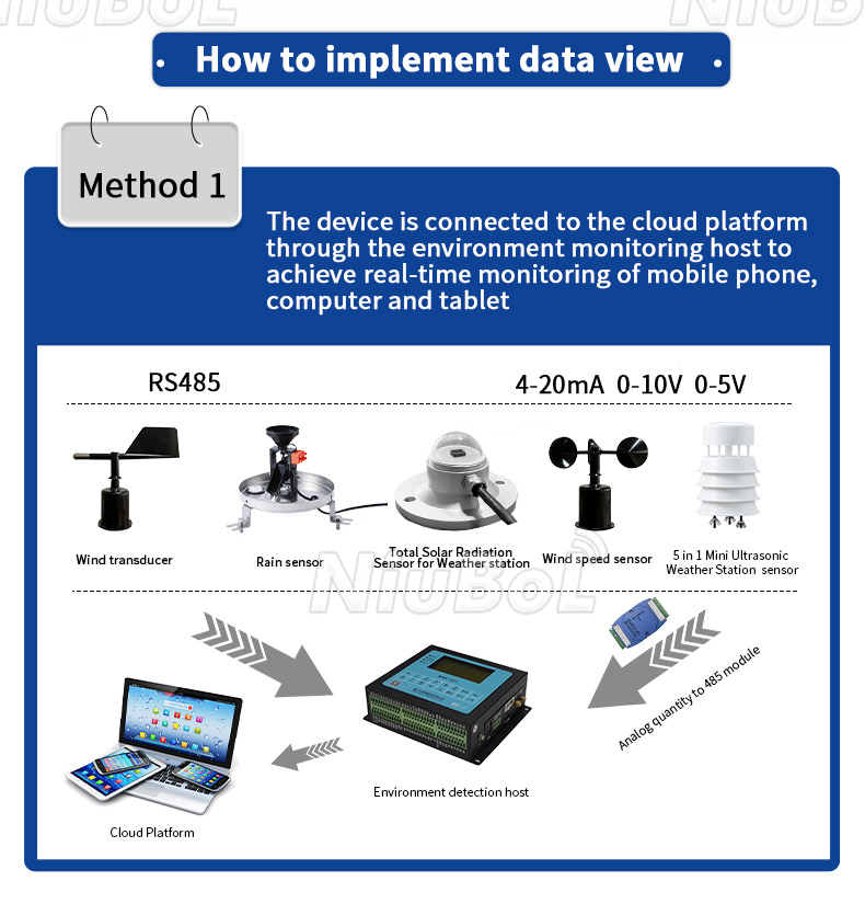 Facile à installer, il fonctionne en continu par tous les temps. En cas d'ensoleillement, le photodétecteur au silicium intégré au capteur génère une tension de sortie proportionnelle à l'intensité lumineuse incidente. Sa sensibilité est proportionnelle au cosinus de l'angle direct de la lumière incidente. Chaque produit possède un coefficient de sensibilité. Il peut afficher directement la valeur du rayonnement en μ*mol/m²*s.