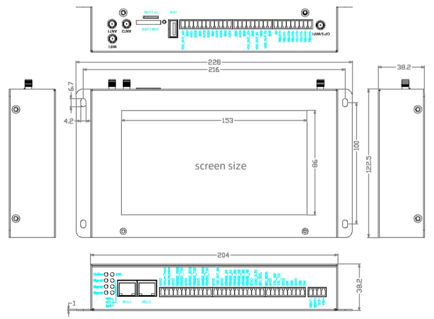 2. 4G/3G*, Écran tactile 7", Flash 1 Go, 1-WAN, 1-LAN, USB, 4-RS232, 3-RS485, 1-I2C, 1-TTL, 8-ADC, 4-DI, 4-DO, 5-Sorties d’alimentation, 1-Emplacement Micro SD, WIFI/GPS*