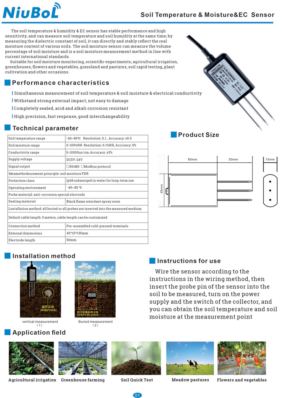 1. Utilisé professionnellement pour mesurer la température du sol. La plage de mesure est généralement comprise entre -40 et 120 °C. Il est généralement connecté à un capteur analogique.