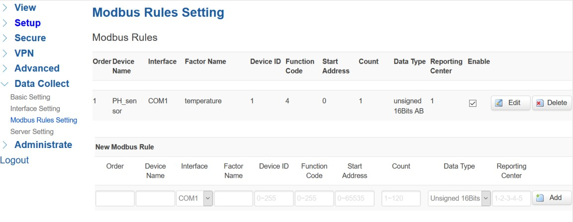 - Configurer le collecteur de données avec le protocole de communication Modbus en fonction de la fiche technique du capteur.